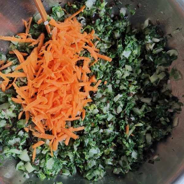 第四步:把小白菜剁碎擠去水分,泡發好的黑木耳剁碎,胡蘿蔔擦絲一起放入盆中,加入花生油拌勻,再加入鹽和雞精攪拌均勻,包子餡就做好了。