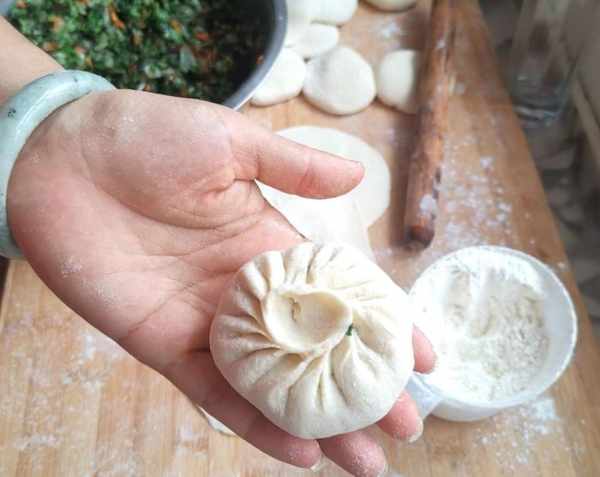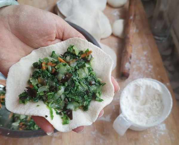 第六步:拿一個包子皮,包上餡料,餡料的多少可以隨意就好。一般素餡的包子我會多放一些餡料。