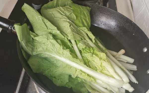 第二步:鍋裏燒開水,把小白菜放到鍋裏汆燙一下,撈出。
