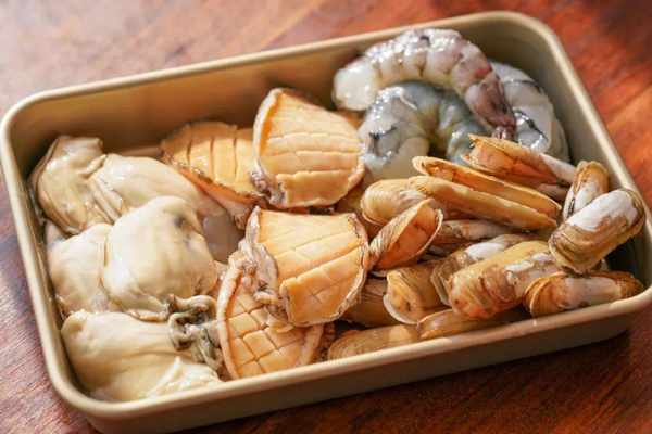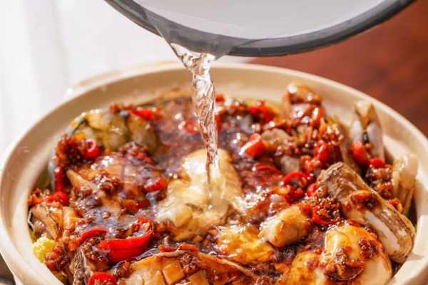 4、鋪上半顆娃娃菜葉、1把泡發的粉絲(提前用溫水浸泡15分鐘)和處理好的海鮮,倒上炒好的醬料和1碗清水。