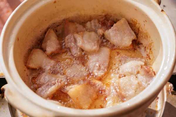 3、砂鍋(或其他厚底鍋)鍋底刷層薄油,開中火,放入200g五花肉片煎出油脂後關火。
