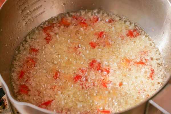 2、醬料:鍋中加2勺食用油,開小火,加入2勺蒜末、2勺小米椒圈炒香後關火,加入2勺生抽、1勺老抽、1勺香醋、1勺蒸魚豉油、1/4勺白砂糖、1/4勺白胡椒粉、1勺蠔油攪拌均勻備用。