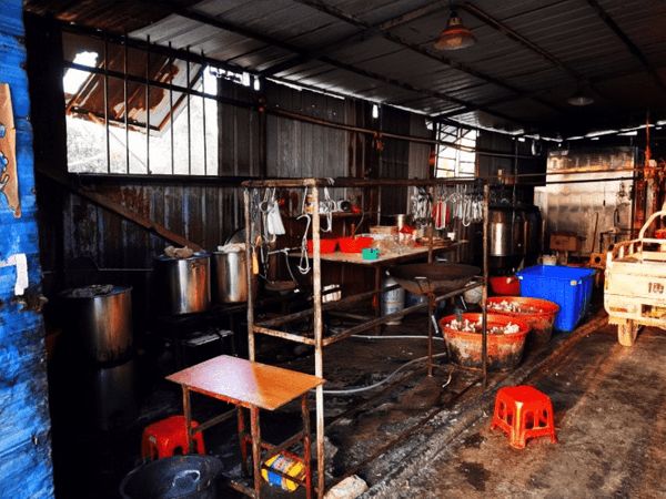 小黑房裡,惡臭撲鼻,20多個大塑料桶裡全泡著羊下水,血污、油污遍地。
