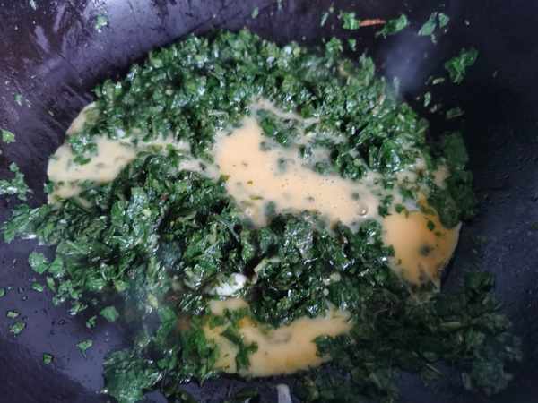 煸炒均勻,加入少許鹽炒勻,然後倒入打散的蛋液。