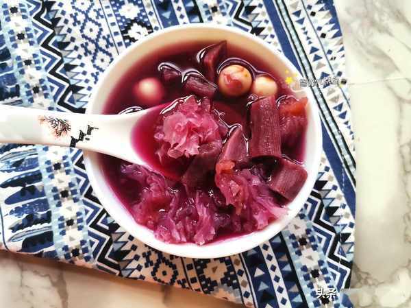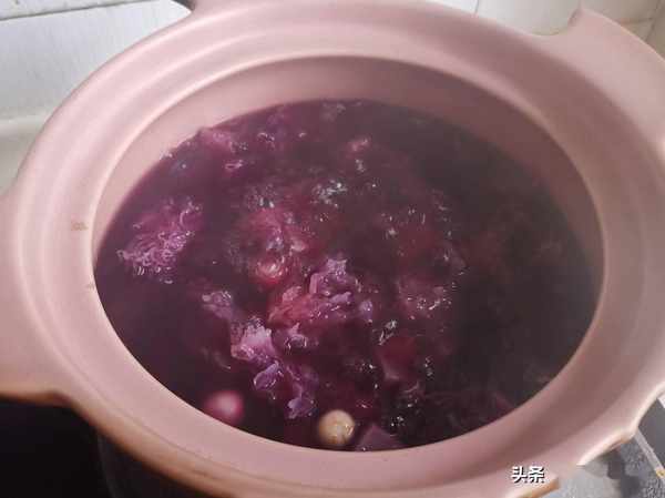 然後加入紫薯和蓮子一起大火燒開,改成小火慢慢煮大約30分鐘,看起來湯羹濃稠,就可以關火。
