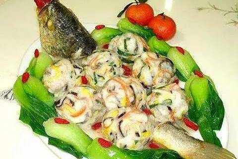 2、魚肉片成一分厚的大片,再切成一寸二分長、一分粗的絲,加上肉、冬菇、冬筍、火腿、蔥、薑末、料酒、白糖、雞蛋清、精鹽二分、淀粉五錢,攪勻成餡,用手擠成八個八分大的丸子,擺在魚架上和兩邊,蒸熟取出,將原湯倒在炒勺內,加上高湯、料酒一錢、精鹽一分、青豆燒開,撒上味精,勾上稀芡,淋上雞油,澆在魚丸上即成。