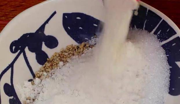 我們來調一下餡,碗中放入30克的白棉糖,一把的黑芝麻,一把的白芝麻,10克面粉,攪拌均勻,我們的餡料就做好瞭。加入的面粉使餡料不宜外流,不宜燙嘴,面放涼以後放在案板上,面團搓成長條,下成大小不均的小劑子,取出面團用手心按扁,按成中間厚邊緣薄,包上餡料。