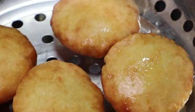 隨意的收口,用虎口捏合一下,揪掉多餘的面團兒,按成小圓餅,5成油溫下入鍋裡,中途多翻幾次面,膨脹越大,炸至飄起就已經熟瞭,繼續的翻面,炸至兩分鐘,炸至雙面金黃就可以出鍋瞭。撈出控油,我們的傢庭版油炸糕就做好瞭,這樣做外酥裡嫩,各個空心,裡邊的糖餡也是非常的均勻好吃,喜歡你也試試。