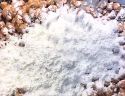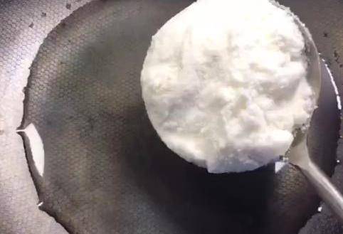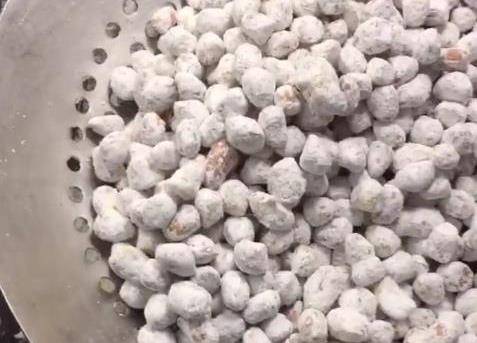 翻炒均勻,朋友們一定要不停的慢慢的翻炒,翻炒至冷卻以後,它就是這個樣子。放的淀粉有點少瞭,所以掛漿不是很厚,但更好吃。如果喜歡掛漿厚的可以多放些淀粉。