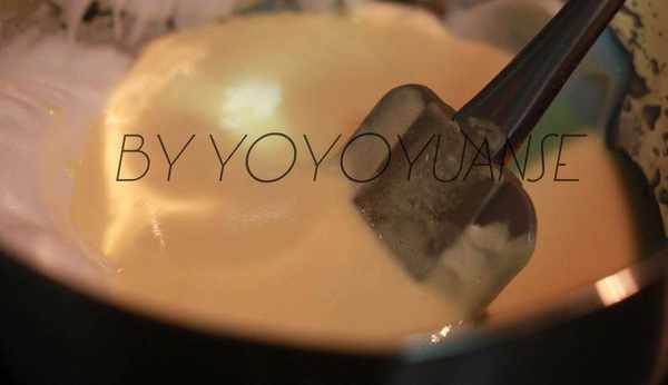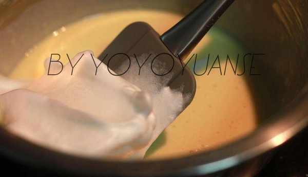 5.將上一步的面糊倒回餘下的蛋白霜內,切拌均勻。