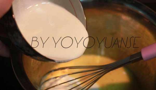 蛋白、蛋黃分離,將蛋黃內加入10g糖,打至稍發白,加入酸奶打均勻。
