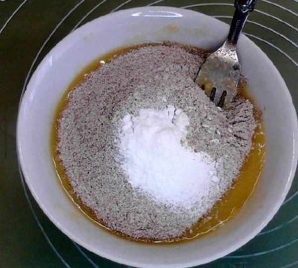 第5步、倒入黑全麥粉和泡打粉,拌成均勻面糊。