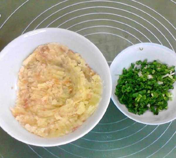 第2步、土豆蒸熟搗成泥,蔥洗凈切成蔥花,備用。
