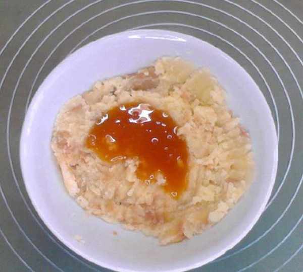 第3步、在土豆泥中加入鮮雞汁,拌勻。