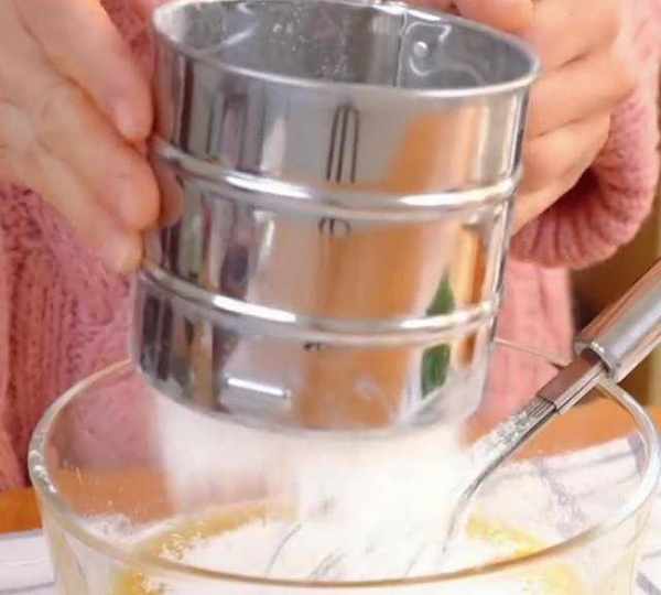 第3步、過篩低筋面粉,用畫Z字形的手法攪拌,這樣可以避免面粉起筋,以免影響餅幹酥脆的口感。
