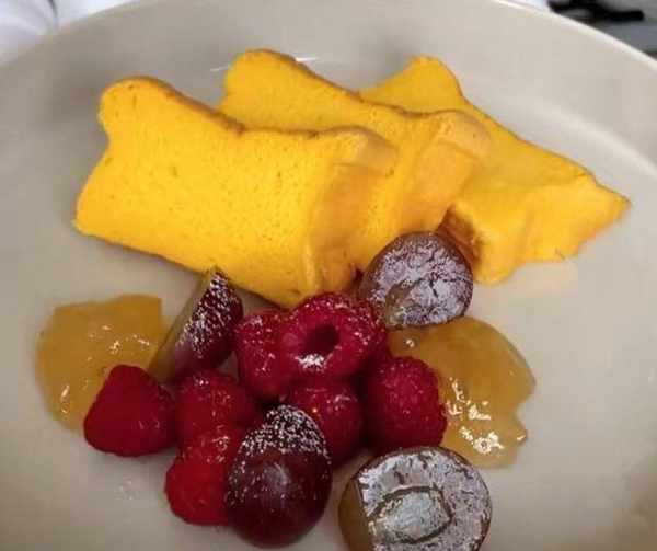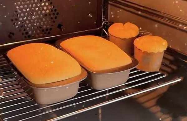 15分鐘時間到瞭,我們再把時間調到160℃,再加20分鐘,因為蛋糕裡面的水分還是太多太濕,但一般35分鐘時間是差不多的,按照你傢烤箱的特點來制定時間。好瞭,時間到瞭,我們開始來檢驗這個蛋糕。非常完美,顏色也非常漂亮,脫模也特別好脫。看看這個蛋糕,好細膩啊,然後中間這個小氣孔也非常細膩,配上自己喜歡的水果和果醬,撒上糖粉,這就是今天的蛋糕作品。