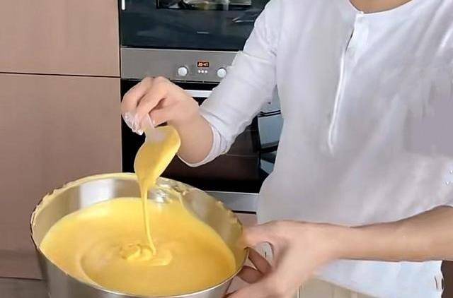 現在我們就把烤箱預熱10分鐘,然後180℃,接下來我們把攪拌好的蛋黃倒入蛋白裡,一個方向輕輕攪拌,減少蛋黃在裡面攪拌的氣泡,接著把50克低筋面粉過篩後倒進去,均勻攪拌,攪拌面粉沒有顆粒就好瞭。接著把軟化後的黃油倒入,繼續攪拌均勻就好瞭,好瞭,這樣的面糊已經非常細嫩,而且很有光澤的。