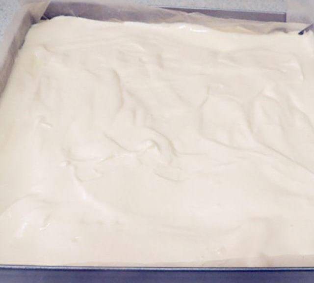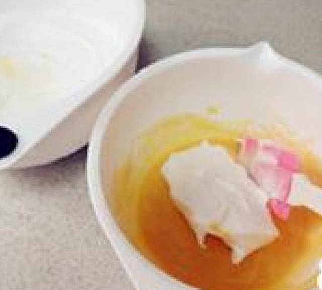 第8步、取一部分蛋白加入到蛋黃糊中,用刮刀切拌均勻,再把取下的蛋白和蛋黃糊全部混合拌勻