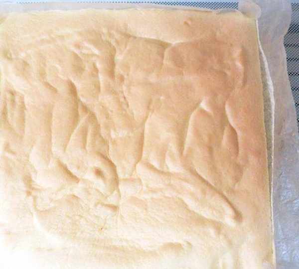 第10步、烤好用手拍一下蛋糕面,不粘手,沒有沙沙聲就好瞭。出爐不用倒扣,連烘焙紙一起拉出烤盤,放在晾網上冷卻至溫涼後撕去烘焙紙