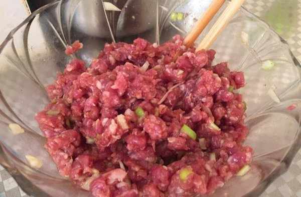 2:準備一塊前腿豬肉,切塊後剁成肉餡,加入蒜末,蔥末,椒鹽,生抽,鹽巴和香油攪拌均勻備用。