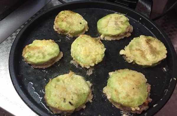 9:平底鍋輕輕刷一層薄油,然後把過好面糊的茄子放進去煎,再翻面煎至金黃。