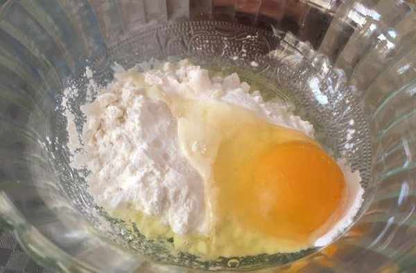 5:面粉和淀粉按照1:1的比例,打入一個雞蛋,加上適量的水。
