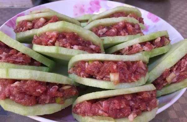 7:茄子片撈起來,瀝幹表面的水分,把肉末夾在茄子中間,重復做好備用。