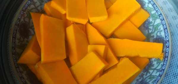 第一部:把南瓜切一塊下來,這裡隻需要300克;先把南瓜去皮,再切薄片,盡量切薄一點,方便南瓜蒸熟;全部切好放盤子裡,放鍋隔水蒸15分鐘左右。