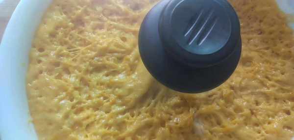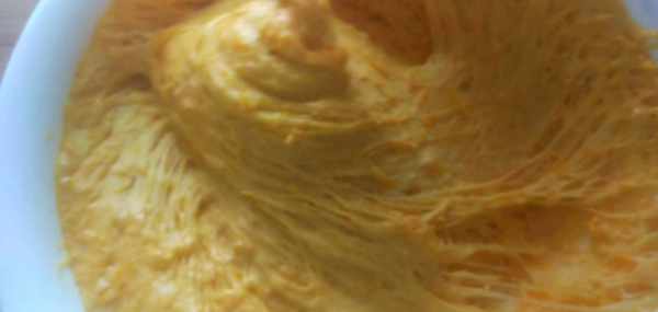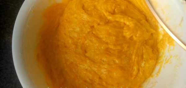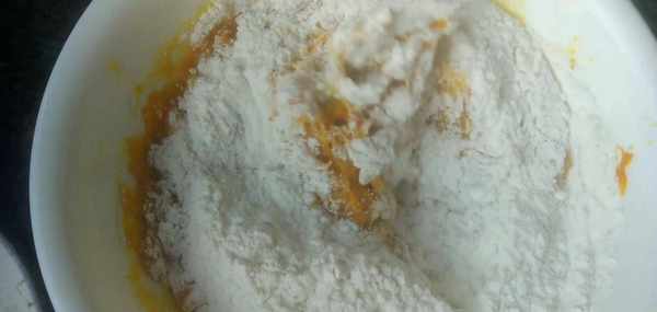 第三部:南瓜壓好後放置不燙手,倒入5克酵母粉,打入兩個雞蛋攪拌均勻;然後倒入300克面粉,要一邊倒面粉一邊攪拌均勻。