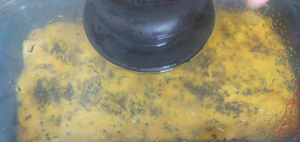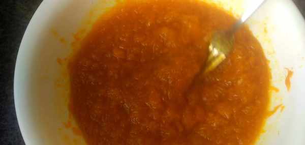 第二部:時間到瞭南瓜蒸熟瞭,筷子能輕松插進去就行,取出倒深一點的碗裡,倒入30克白糖,把它壓成泥。