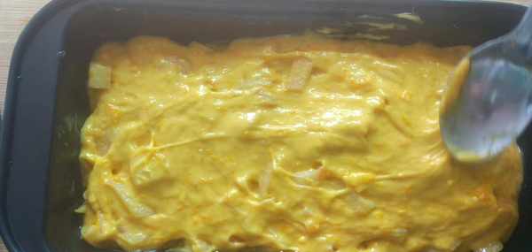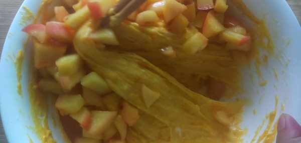 第八部:把炒好的蘋果丁加入面糊裡,再用筷子攪拌均勻;然後準備一個模具,用刷子刷上食用油,再倒入面糊,用勺子把它壓平整,蓋上蓋子再次醒發10分鐘。