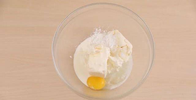 4、奶酪芝士提前從冰箱裡拿出來軟化一下,放入白砂糖跟雞蛋,然後加入牛奶跟淡奶油,然後再加入玉米淀粉跟酸奶油。