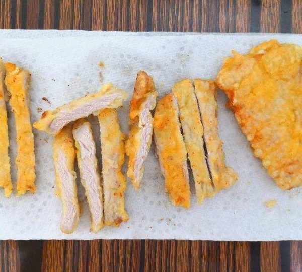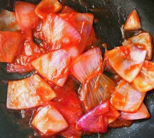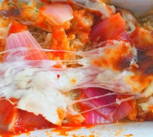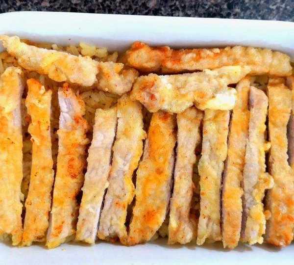 原料:豬排、洋蔥、米飯、料酒、精鹽、胡椒粉、淀粉、雞蛋、醬油、番茄醬、橄欖油、芝士碎。