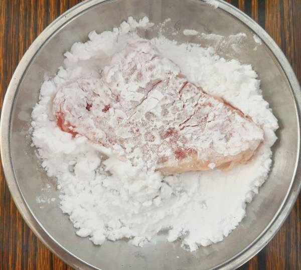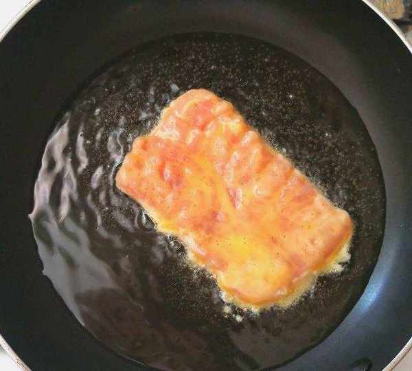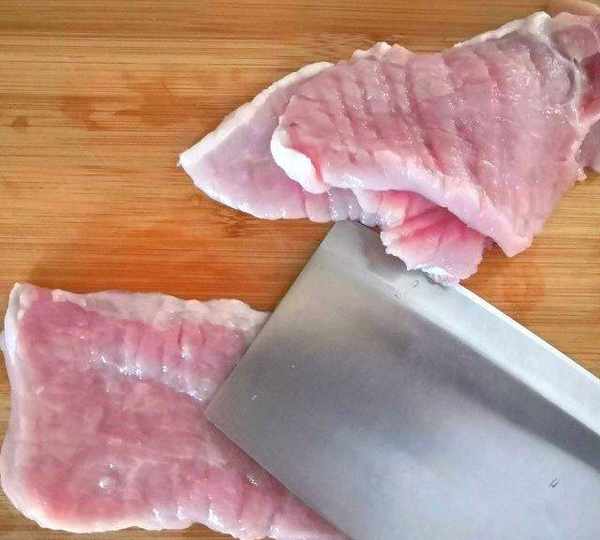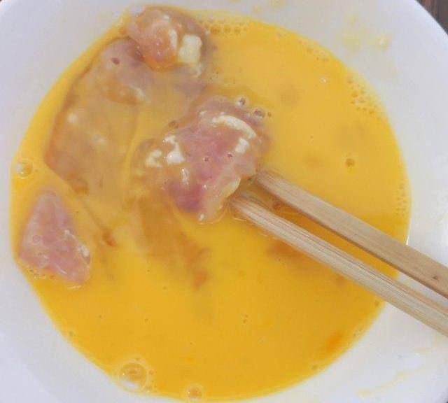 第5步、油鍋燒至七成熱(油開始頻繁波動,伴有少量油煙出現),放入豬排。