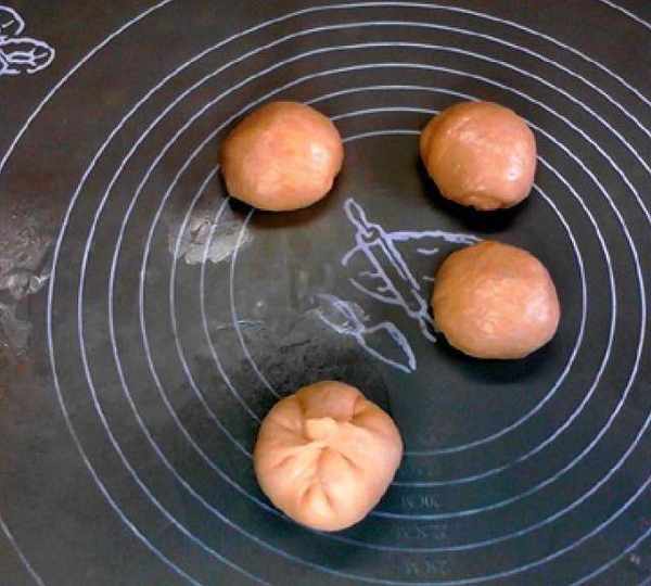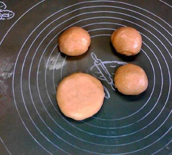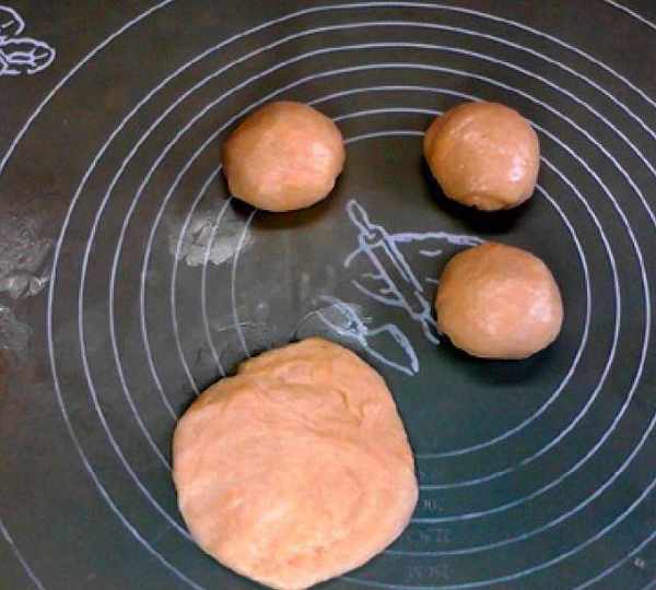 第5步、將面團排氣,切成4等份滾圓,室溫蓋保鮮膜松弛半小時,松弛好後將面團按扁。