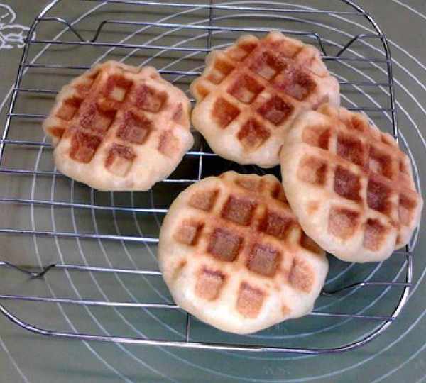 發酵面團華夫餅,中筋粉面團。芝士與花生醬好像比較搭。中筋粉的面團比之低筋粉面團多瞭一分韌性和嚼勁。熱力讓面團漲成白胖子,看起來很是松軟暄騰。