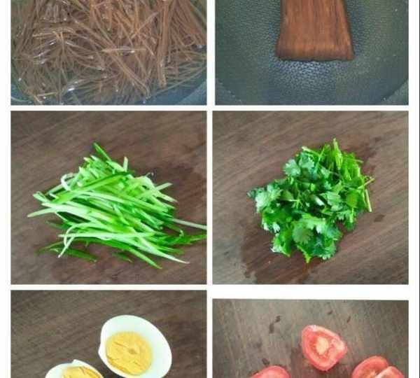第4步、冷面涼水下鍋,抖散,煮3分鐘然後過涼或冰鎮一下,雞蛋要煮7,8分鐘,去皮切開備用切2半,切2片西紅柿,一點黃瓜絲和香菜。