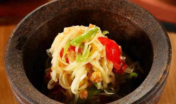 把椰糖、蒜汁、魚露、檸檬水兌在一起調成汁,和處理好的木瓜絲、螺絲椒、小番茄、海米、蒜末、泰椒、花生拌勻即可