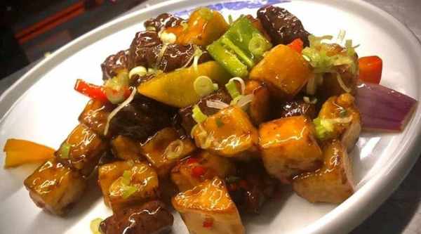 醃制三角肥牛粒250克、茄子粒200克、青紅椒角50克