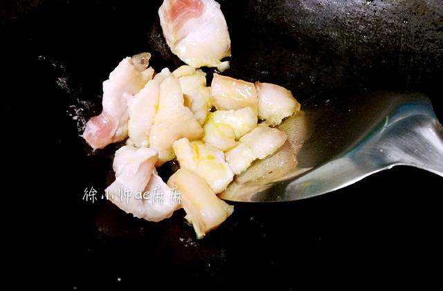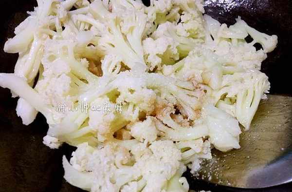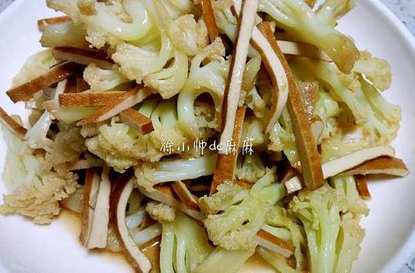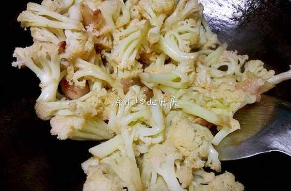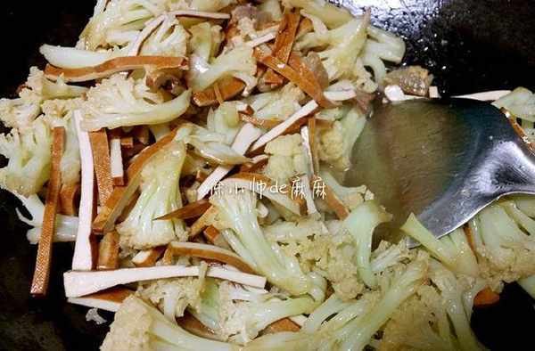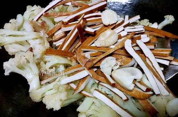 3、熱鍋先將肥肉煸炒出油,將花菜放進鍋內,加鹽和生抽快速翻炒。然後將豆幹和蒜子放進去和花菜翻炒均勻即可。