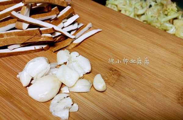 1、花菜一顆,用剪刀剪開,這樣出來的花菜不會碎渣渣的,吃起來味道好!剪開的花菜漂洗幾次。豆幹切絲,拍碎幾顆蒜子,少許肥肉備用。