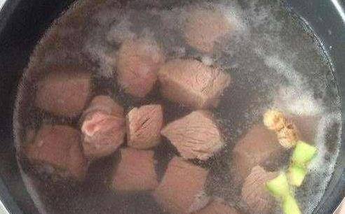 2、鍋中放入適量的清水,然後將切過的牛肉放入鍋中,大火煮開,然後用勺子舀去上面的浮沫撈出,在涼水當中過一下。