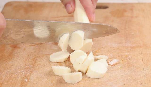 3、、山藥洗凈去皮,滾刀切成小塊,放入清水中待用。