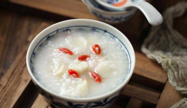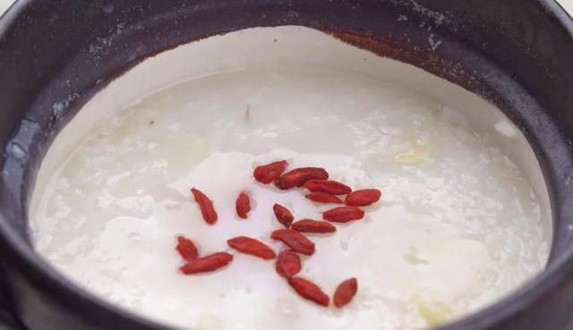 7、放入洗凈的枸杞,稍煮即可。美味營養的枸杞山藥粥就做好瞭。