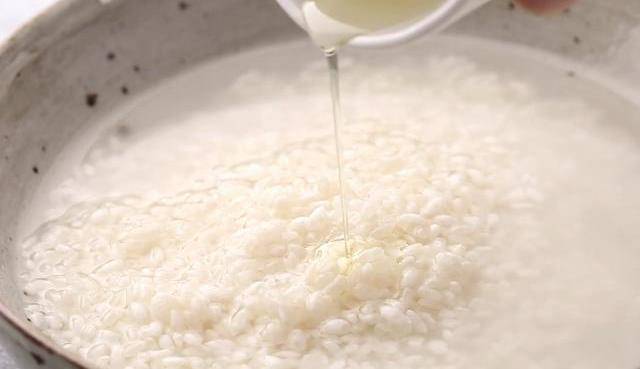 2、米中加入1茶匙油拌勻。這樣可以節省煮粥時間,煮出的粥也更香滑。
