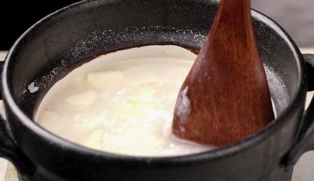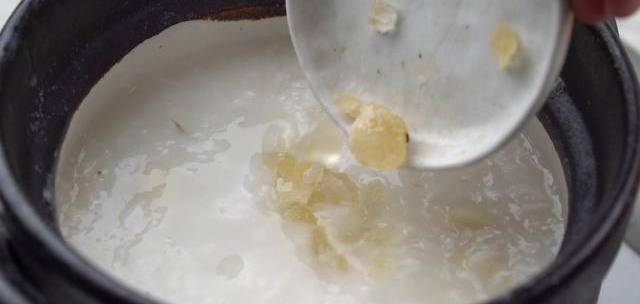 6、水米融合,柔膩為一,粥已成,放入壓碎的冰糖攪拌均勻。