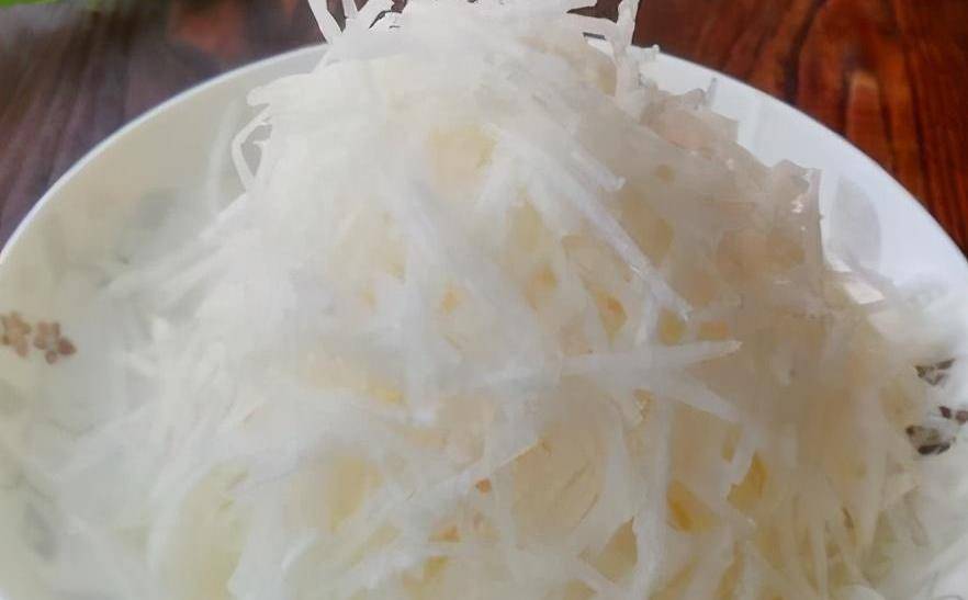 卜洗凈去皮切成細絲放到碗裡。幹紅辣椒切小段放在水裡浸泡一會。薑切絲,