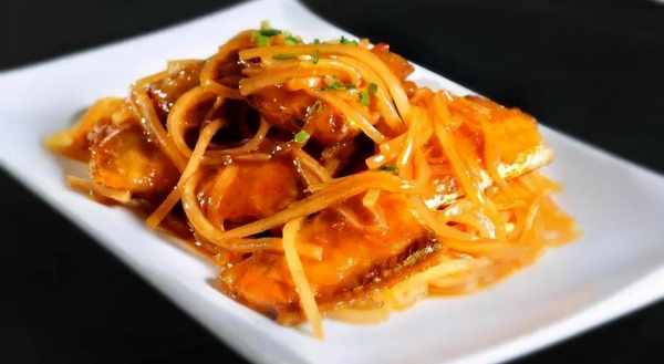 紅油後放入蘿卜絲均勻翻炒。蘿卜絲上色後放入煎好的帶魚。