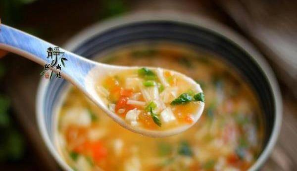 金針菇豆腐湯食材:金針菇1把、嫩豆腐1盒、西紅柿1個、蒜半頭、油鹽適量、水淀粉少許、香菜1棵。