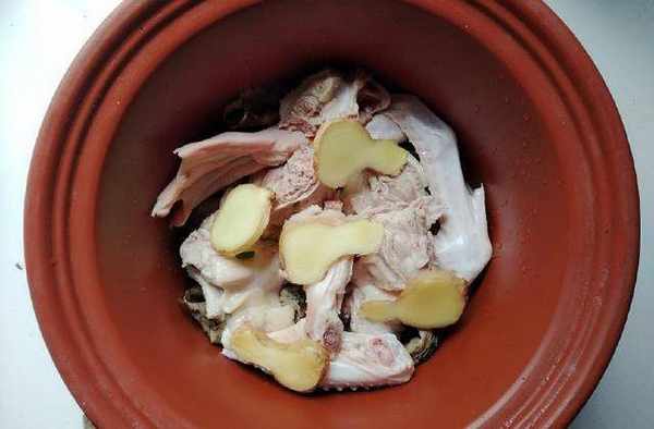焯水後的鴨肉清洗幹凈,放到荷葉上面。然後放入生薑片,加清水,加料酒少許。電砂鍋包制約2小時。